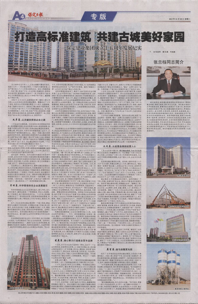 保定日?qǐng)?bào)專版報(bào)道集團(tuán)公司成立十五周年
